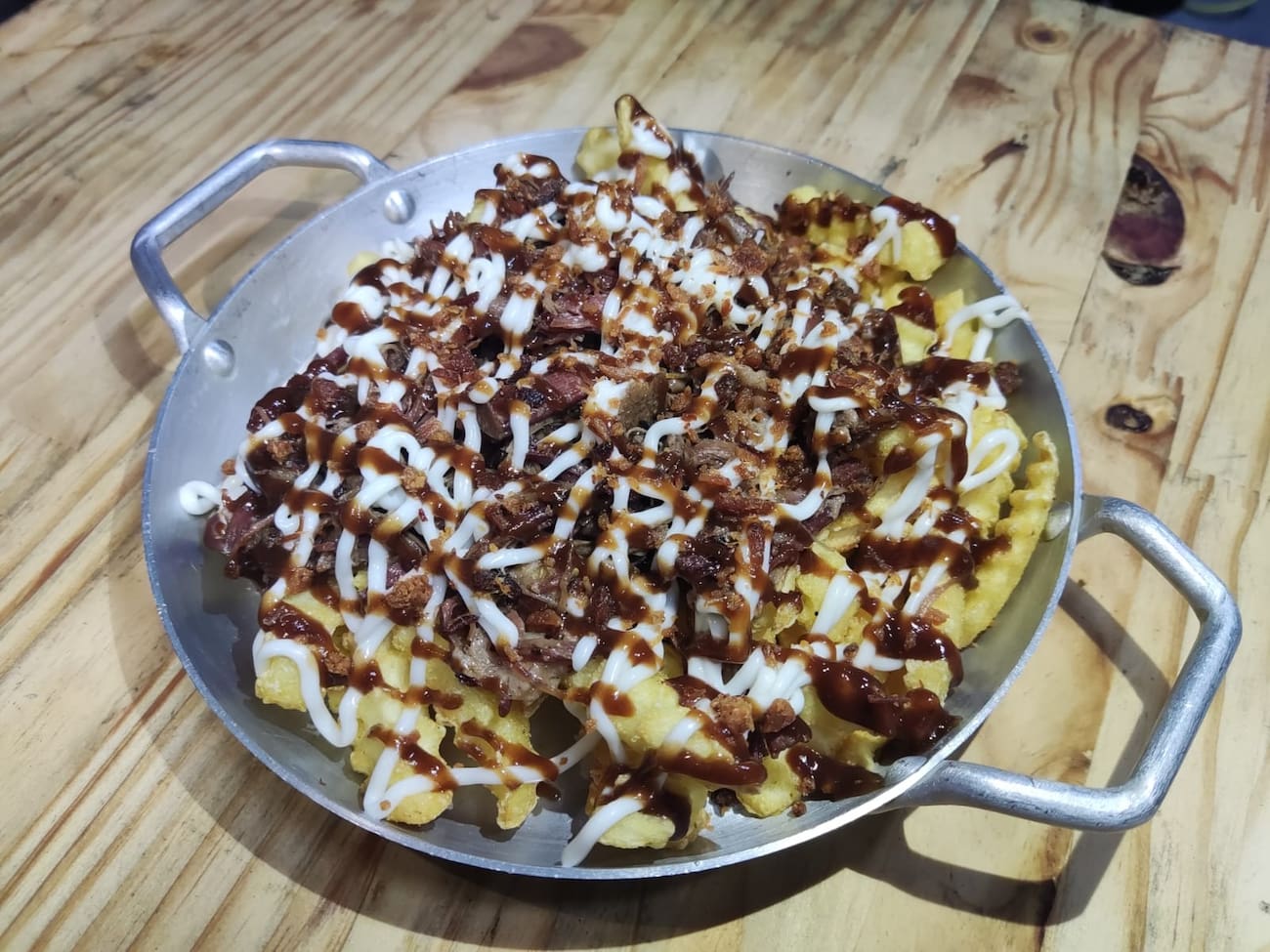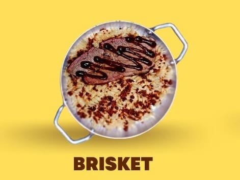 Batata Crinkle 300g + 100g Brisket (Peito Bovino Defumado) + barbecue, requeijão e Farofa de bacon das galaxias.