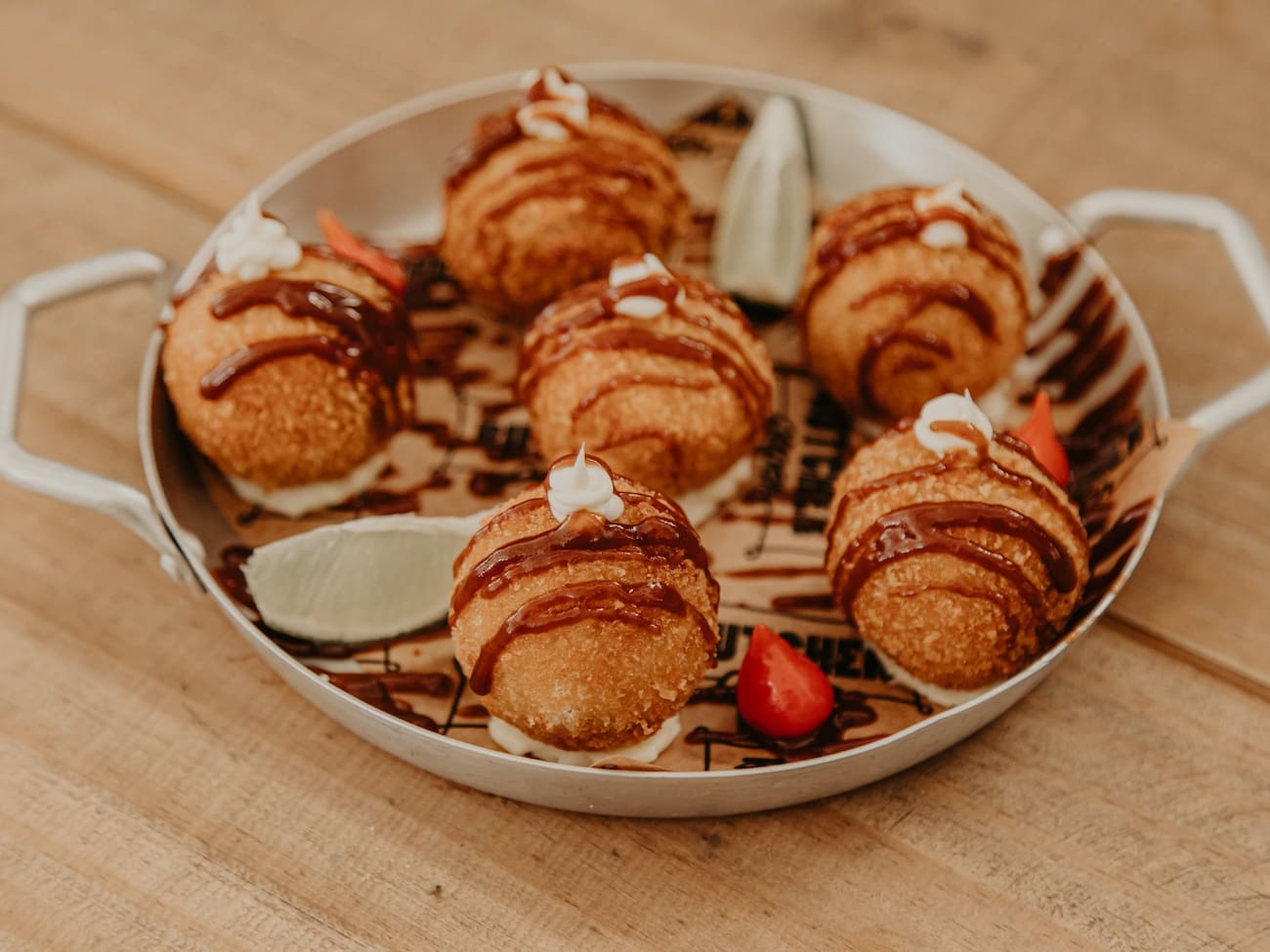 5x Bolinho (S/ massa só o ouro)- Feito com Sobre paleta suína desfiada e recheado com muçarela, empanado e frito. Aproximadamente 65g cada Acompanha: Bbq e maionese verde . Todas Proteínas Defumadas com Lenha Frutífera. (Ameican Bbq)