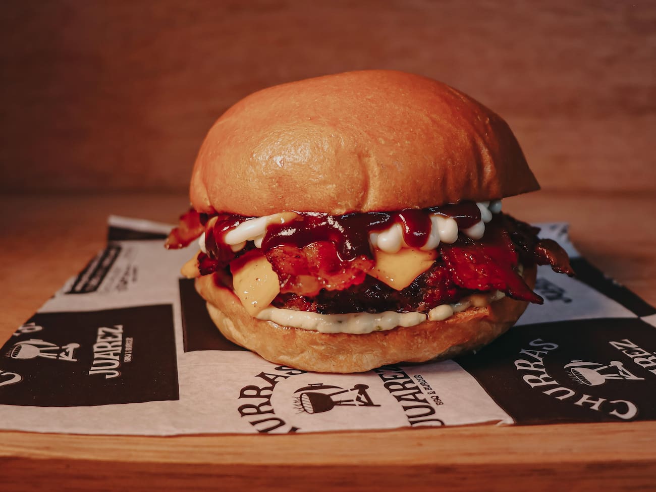 Pão, Maionese da casa, Burger 180g Angus Defumado, queijo, Bacon, Requeijão, Bbq