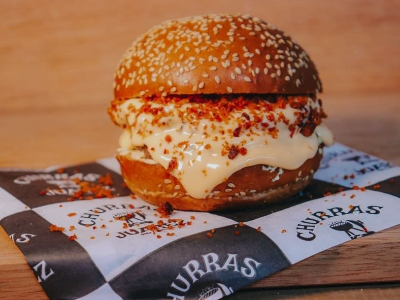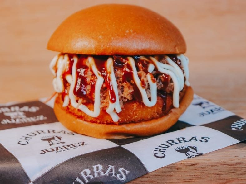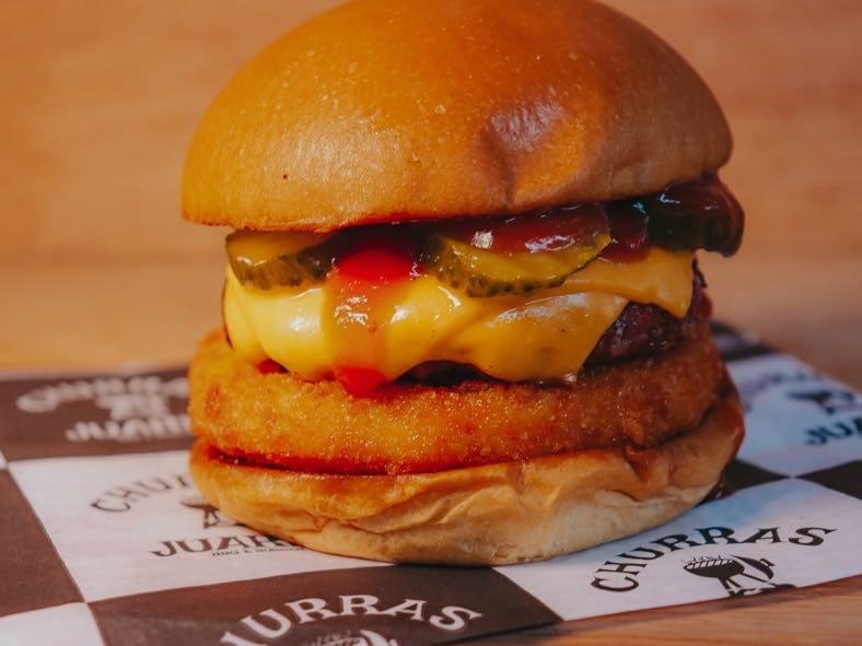 Pão, Catupiry Empanado, Burger 180g Angus Defumado, queijo, picles de pepino agridoce e ketchup