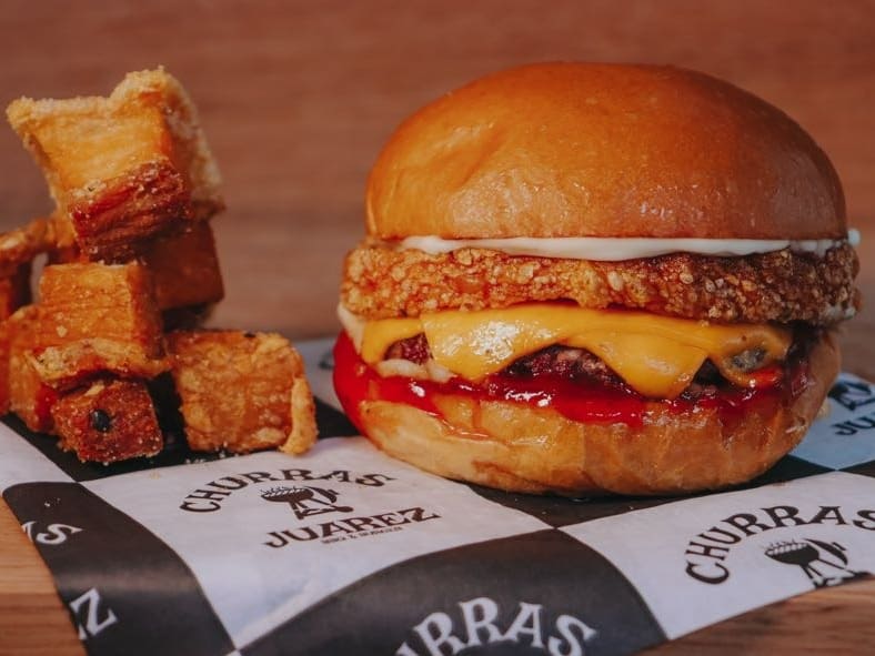 Pão, Requeijão, Burger 180g Angus Defumado, queijo, Disco de Torresmo, Goiabada levemente picante