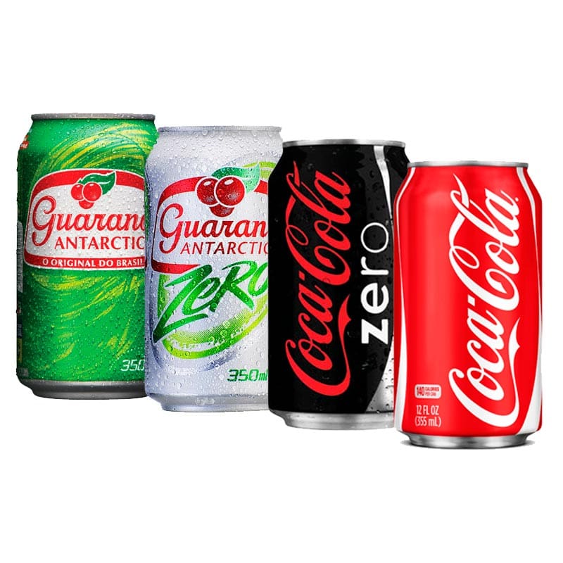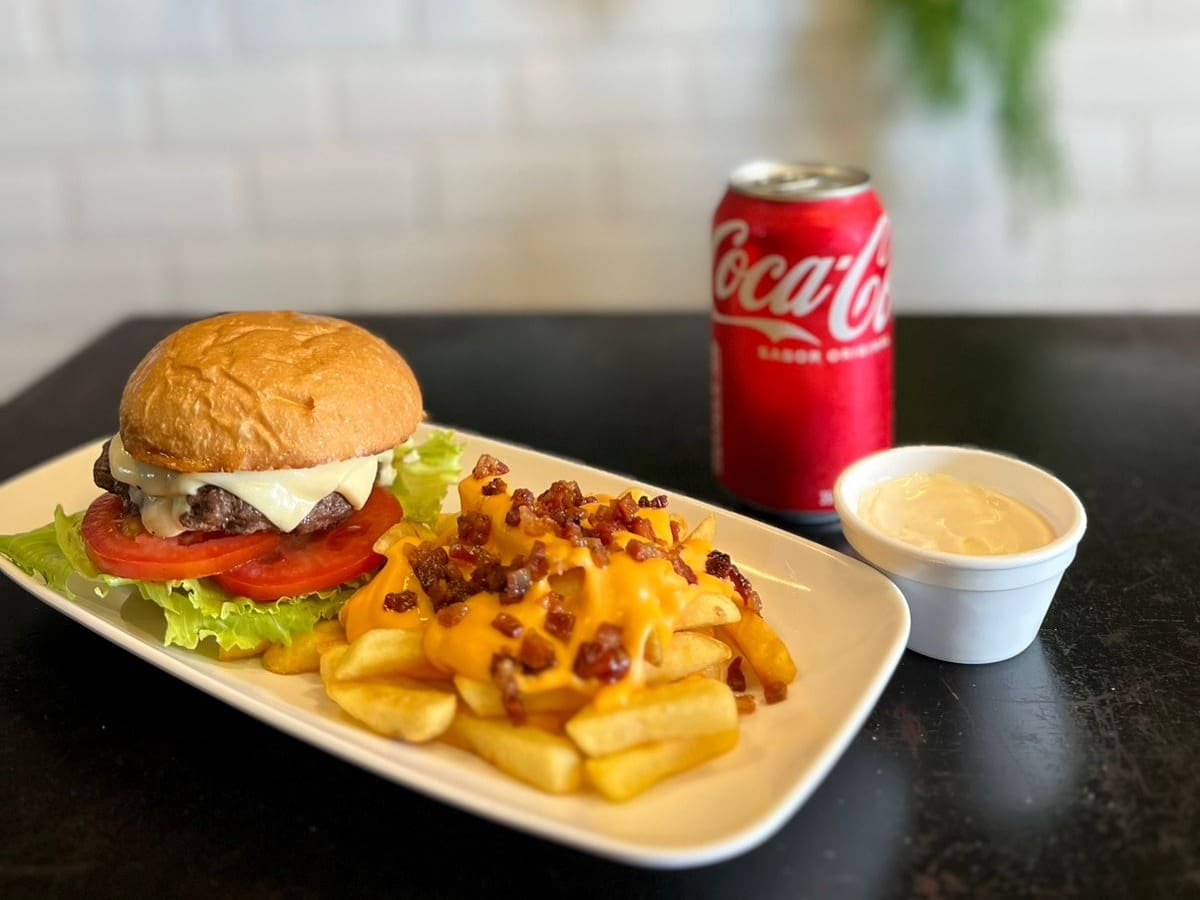 Hambúrguer de fraldinha, queijo mussarela, alface e tomate. Batata frita com cheddar cremoso e bacon. Refrigerante lata.