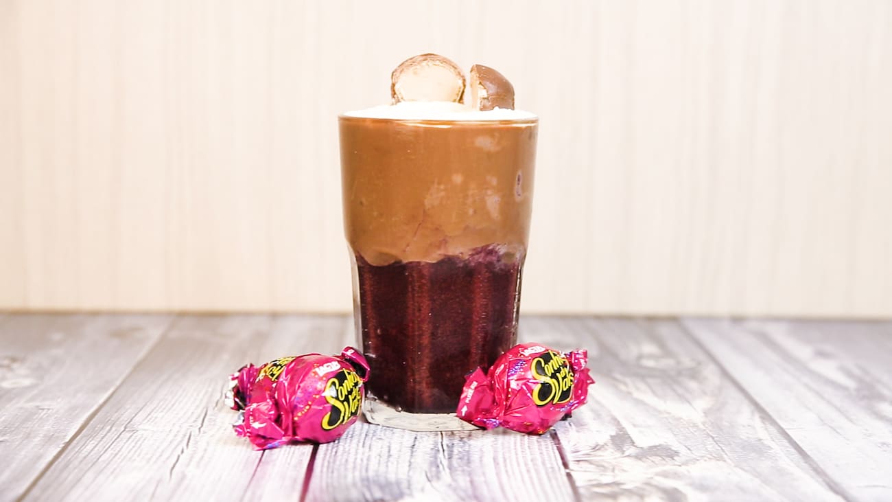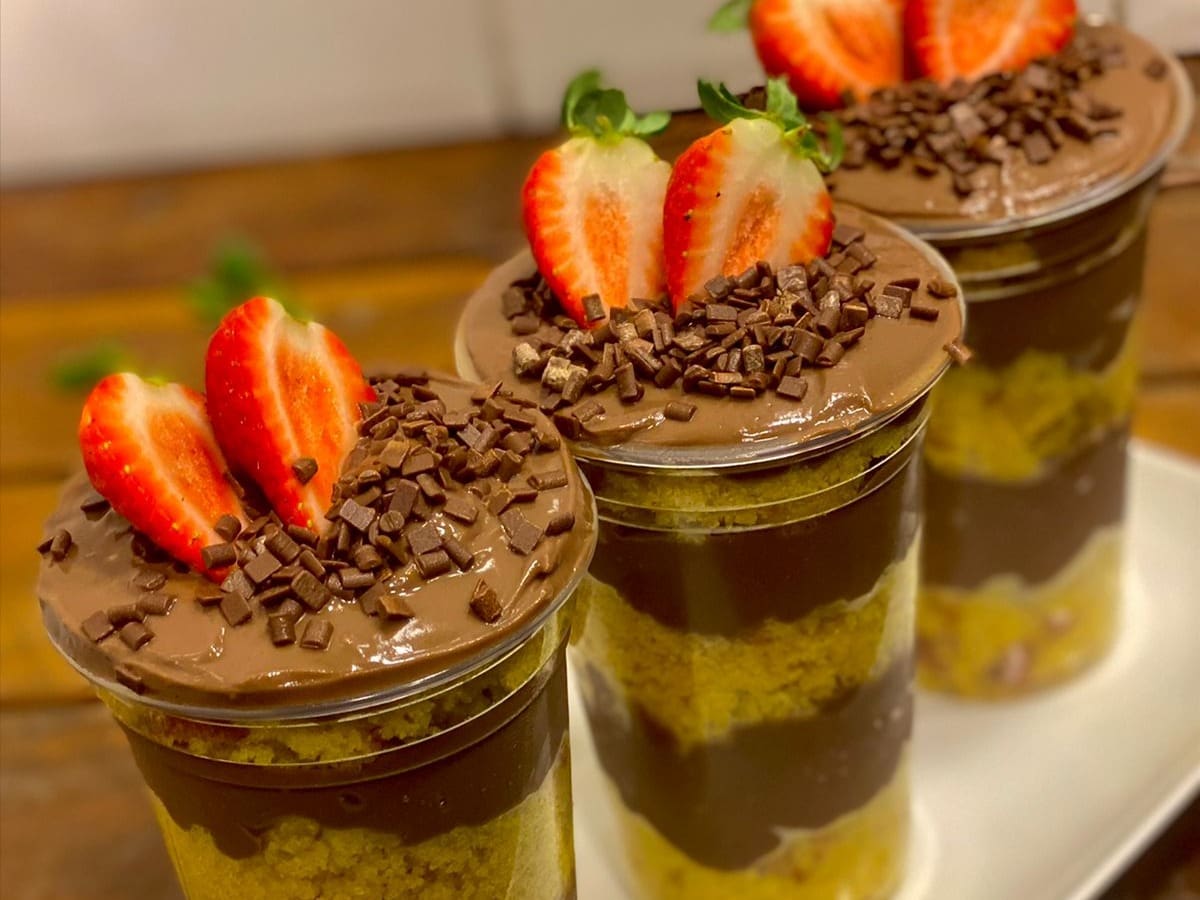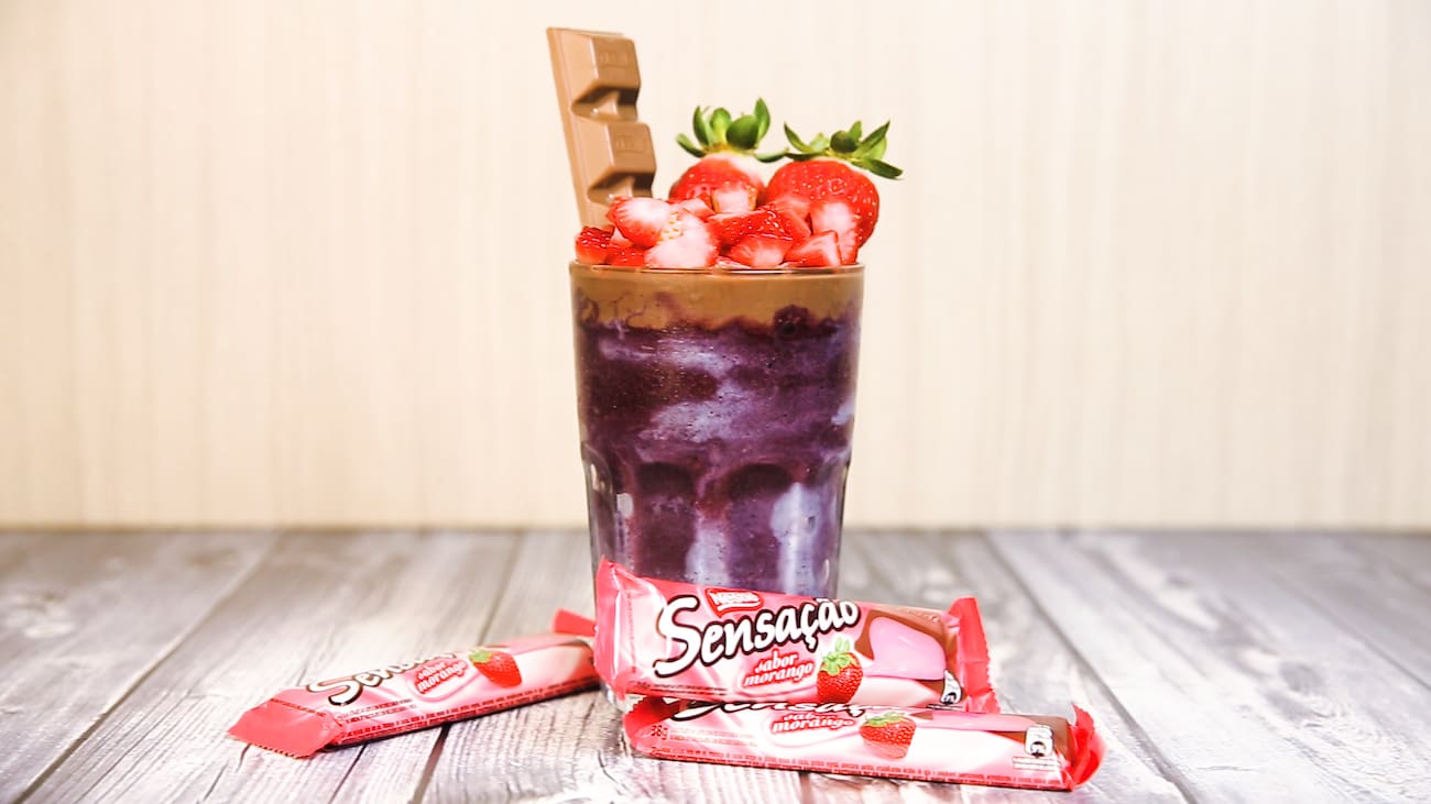 Chocolate sensação, leite condensado, ganache de chocolate preto e morango.
