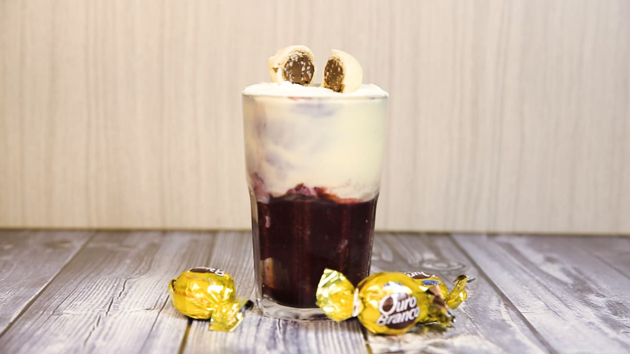 Chocolate Ouro Branco, leite em pó, ganache de chocolate branco.