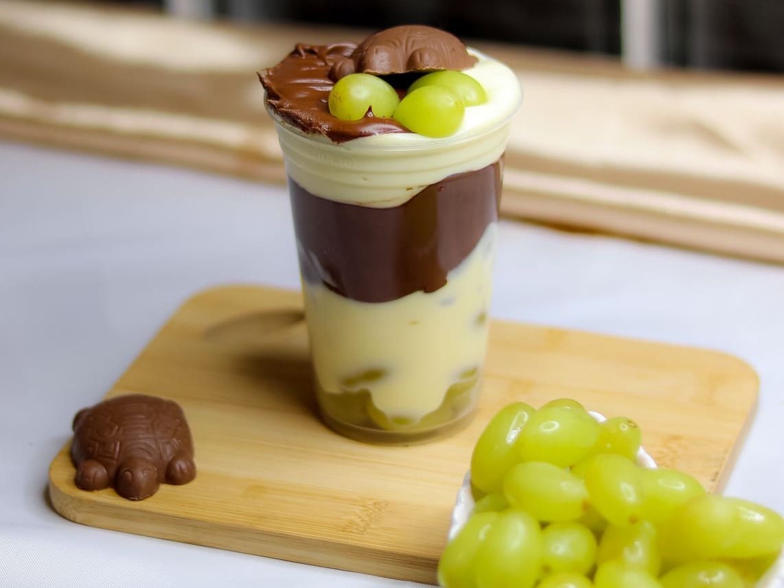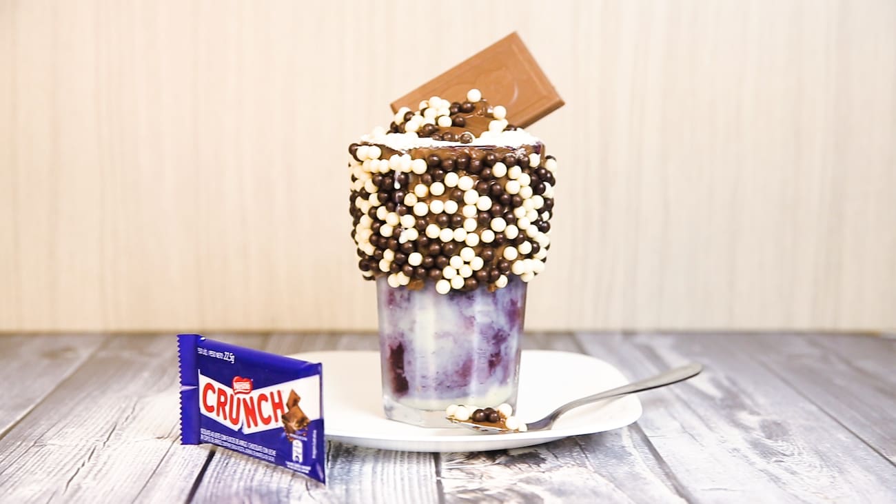 Chocolate crunch, leite condensado, leite em pó, cereais de chocolate e Nutella.