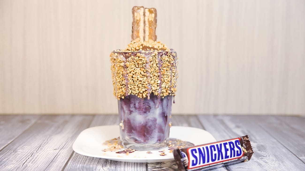 Chocolate Snickers, leite condensado, amendoim triturado e Nutella.