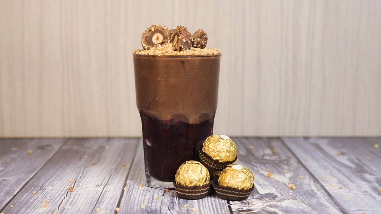 Chocolate ferrero rocher, ganache de chocolate preto e amendoim triturado.