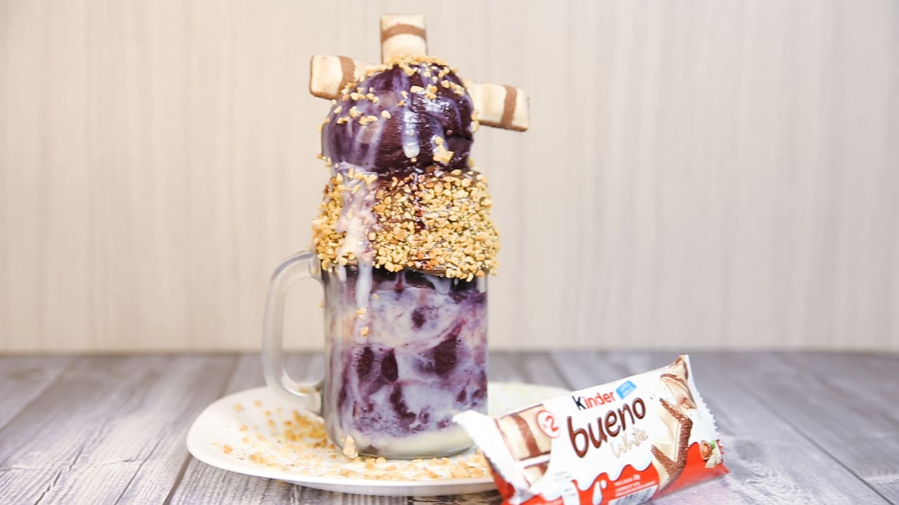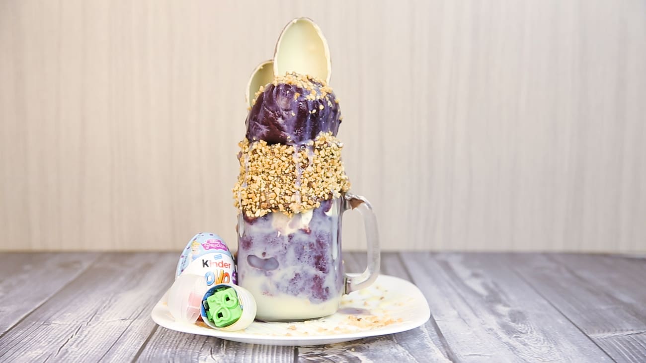 Chocolate Kinder ovo, leite condensado,leite em pó, Nutella e amendoim.