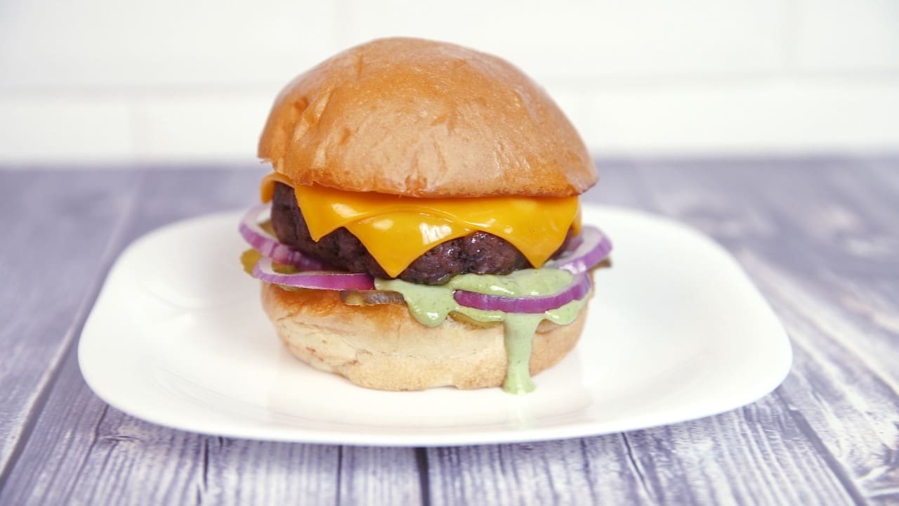 Hambúrguer de fraldinha, cebola roxa, queijo cheddar, picles e molho da casa.