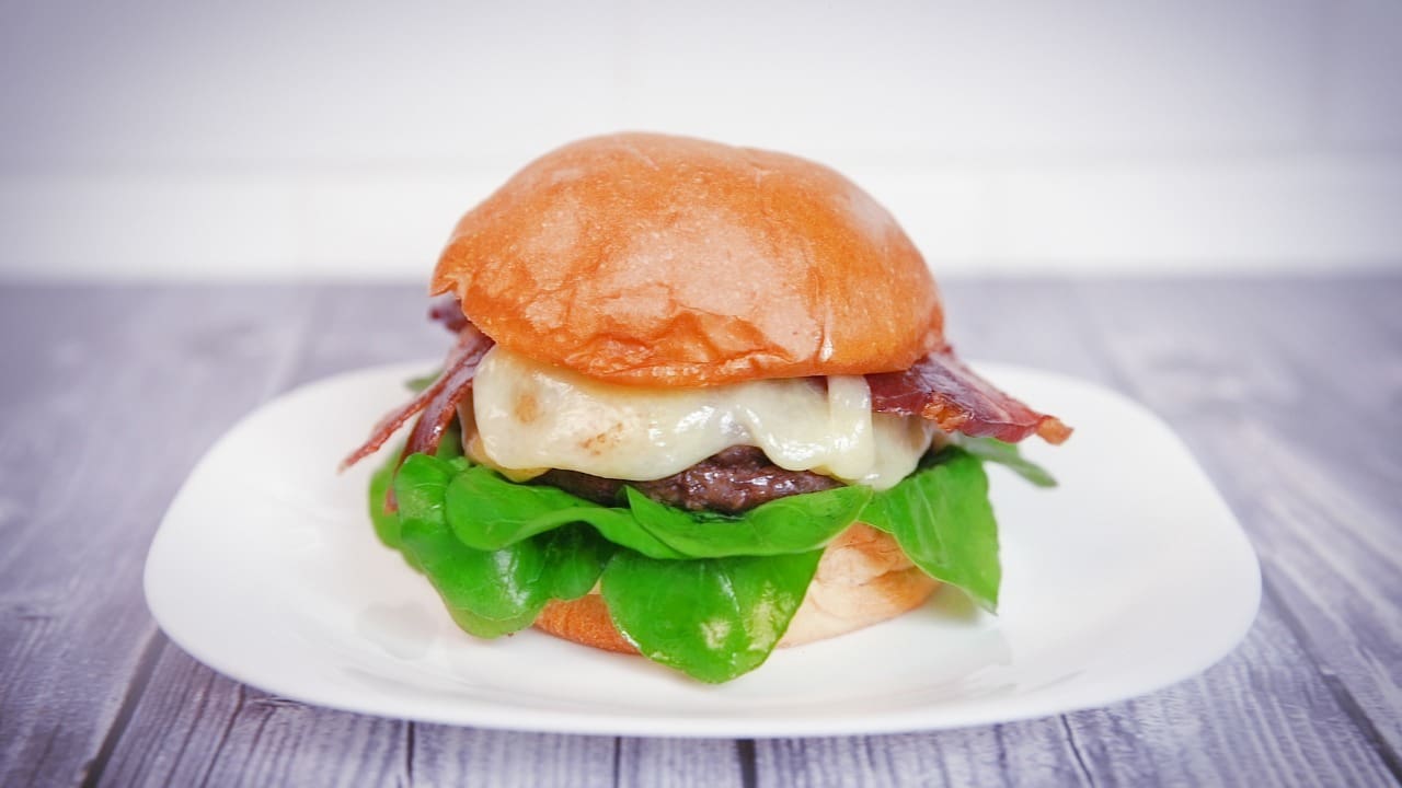 Hambúrguer de fraldinha, rúcula, bacon em fatia, queijo mussarela e barbecue.