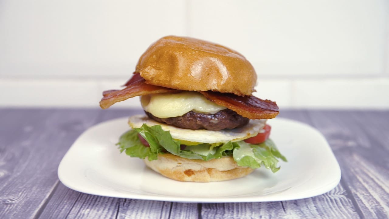 Hambúrguer de fraldinha, queijo mussarela, ovo, bacon em fatia, alface, tomate e molho da casa.