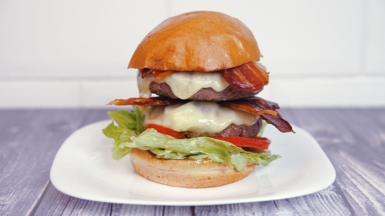 2 hambúrgueres, queijo mussarela, bacon, tomate, alface e molho da casa.