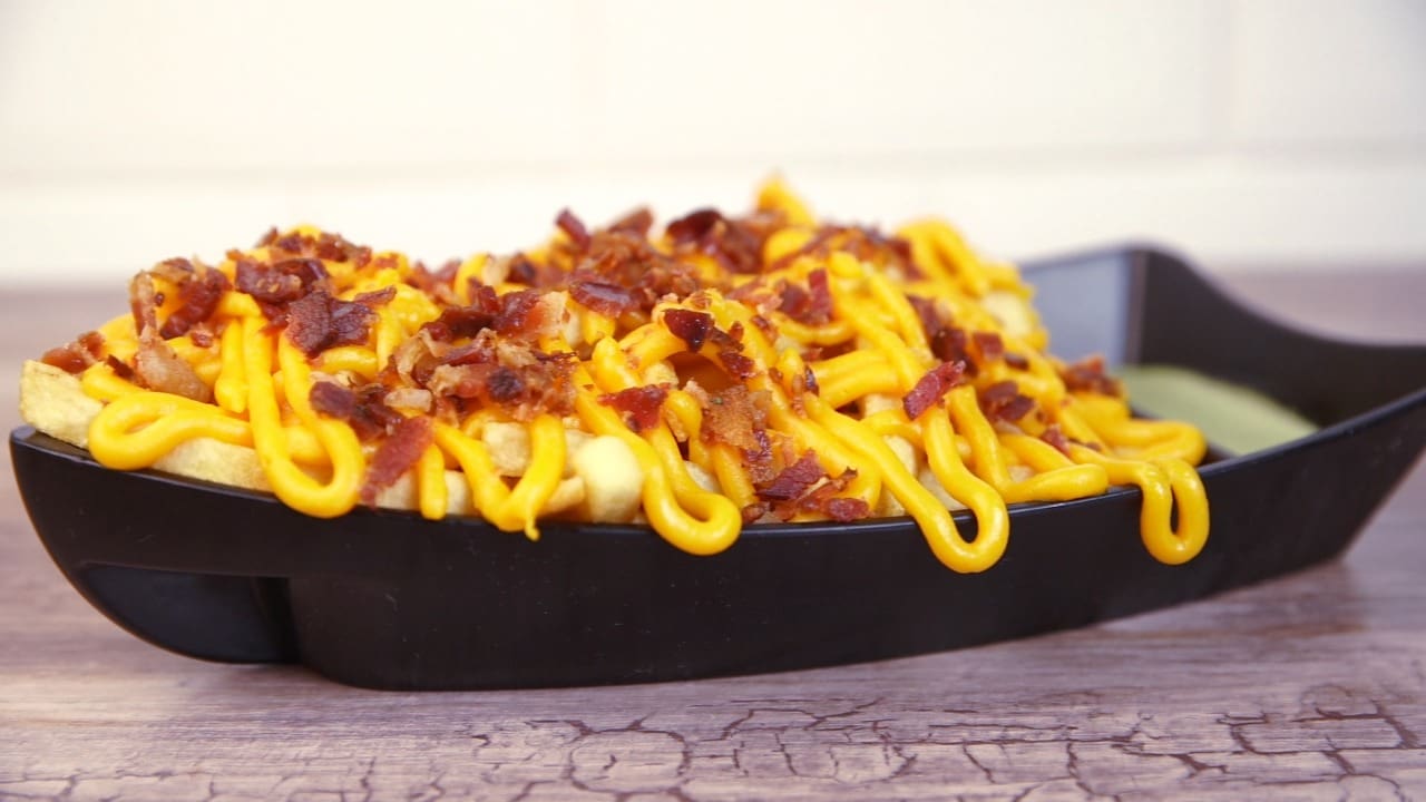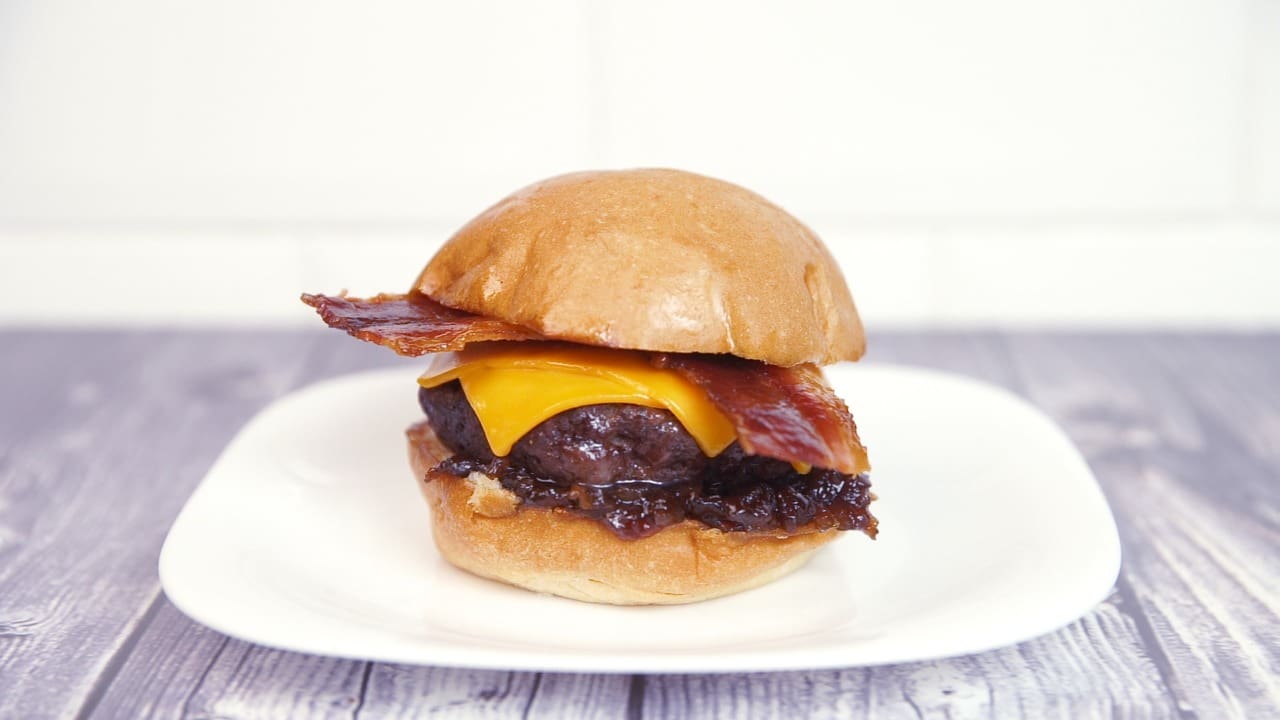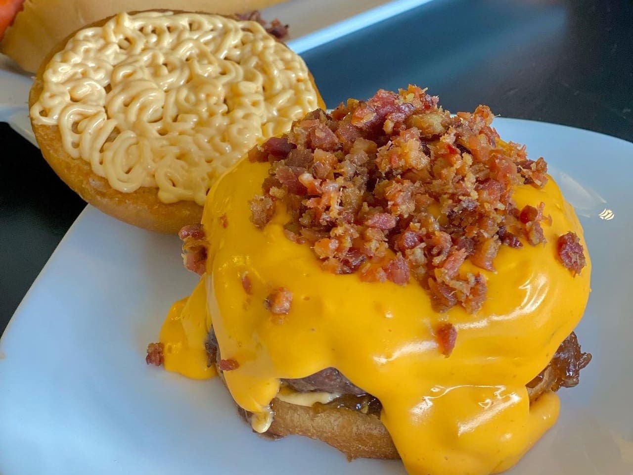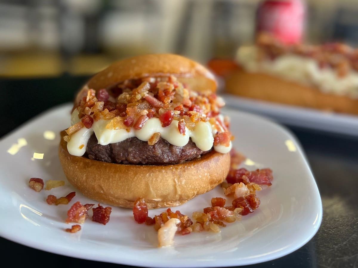 Hamburguer de fraldinha, maionese a base de cheddar, cebola caramelizada, cheddar cremoso e bacon.
