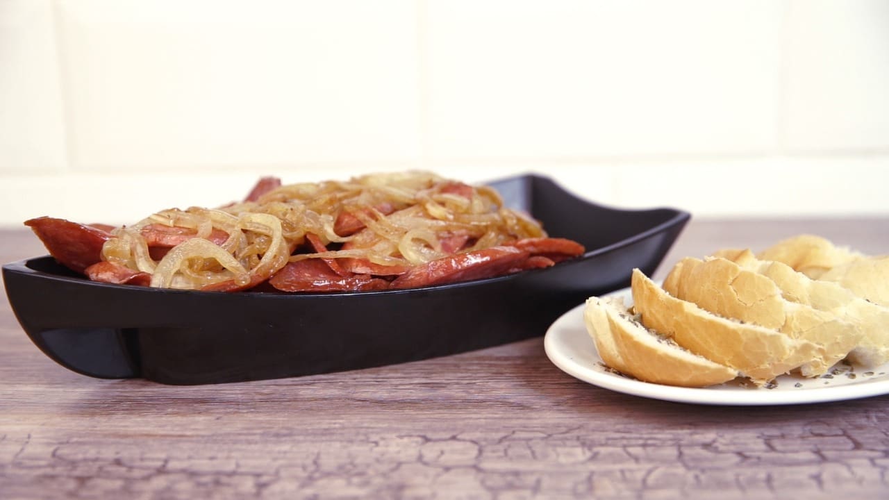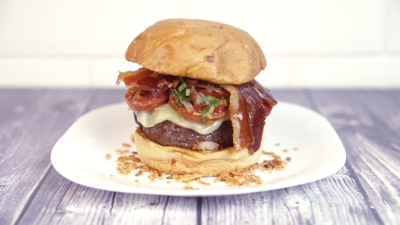 Hambúrguer de fraldinha, mussarela, calabresa, bacon, vinagrete e cebola crocante.