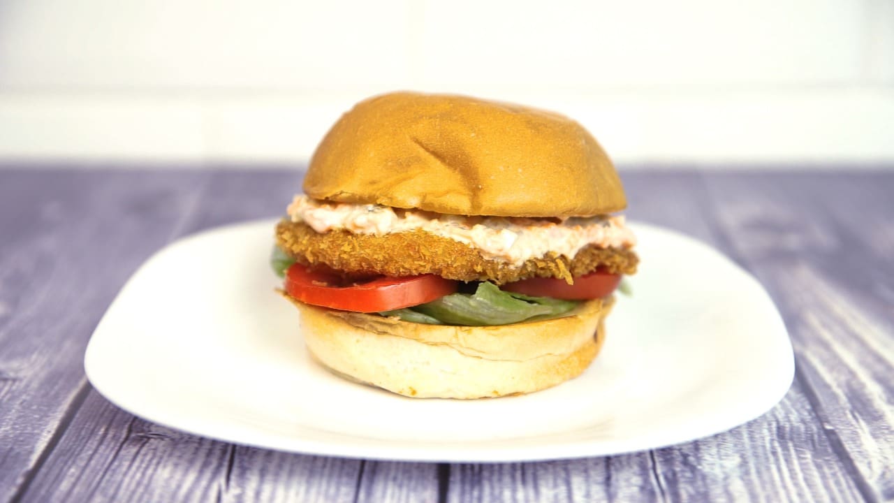 Filé de frango empanado, alface, tomate e molho tártaro.