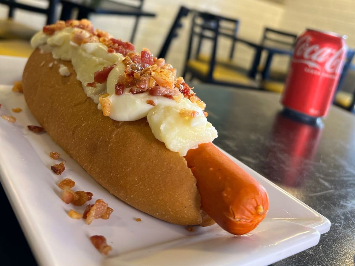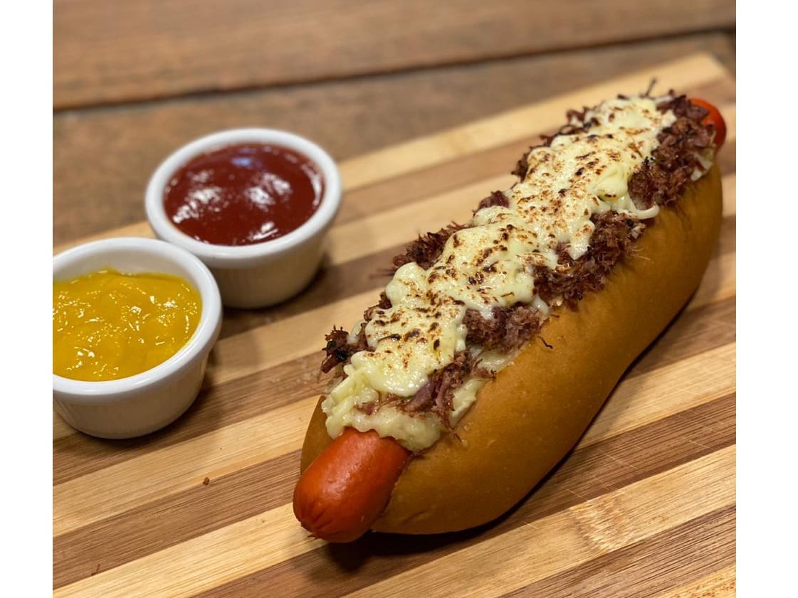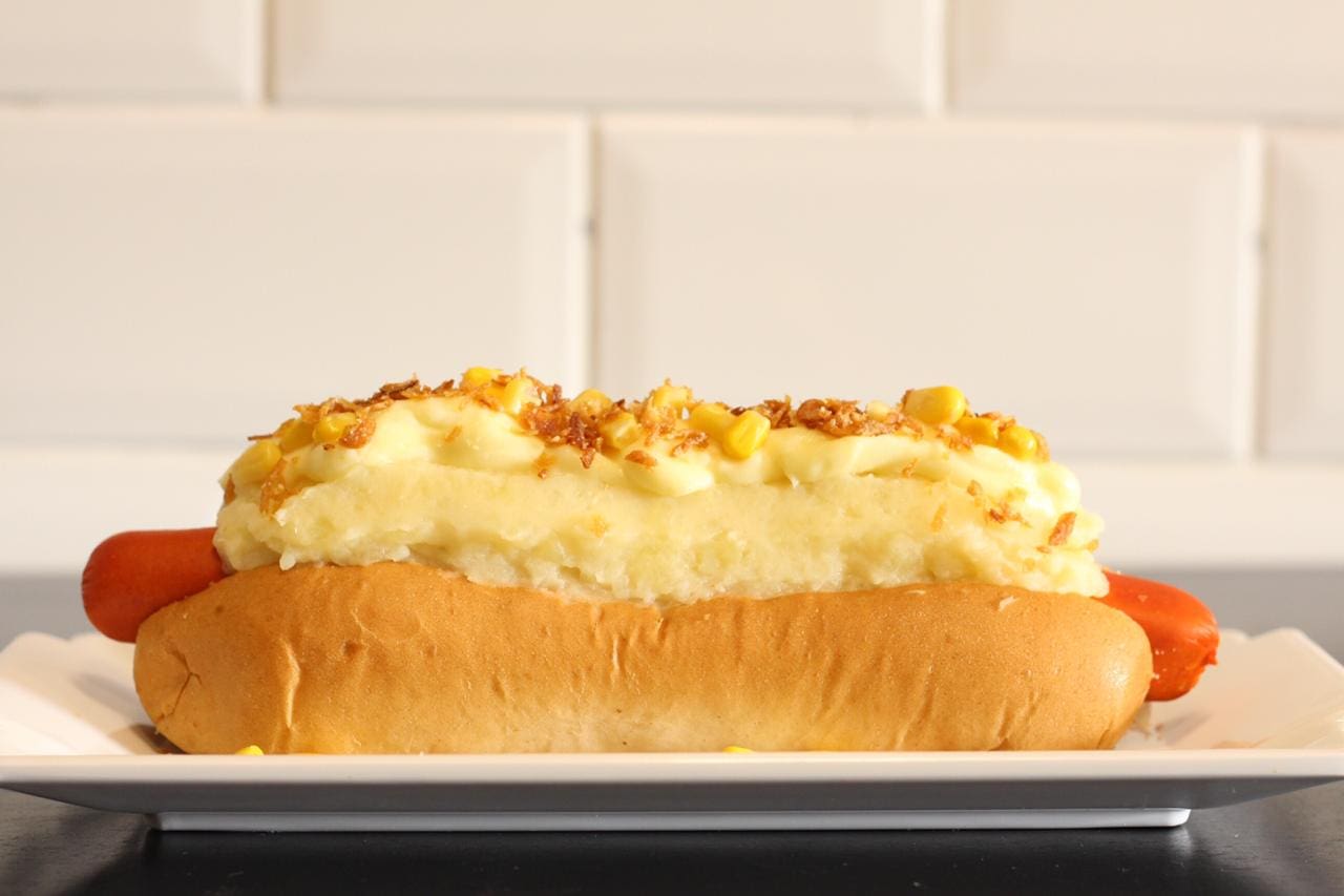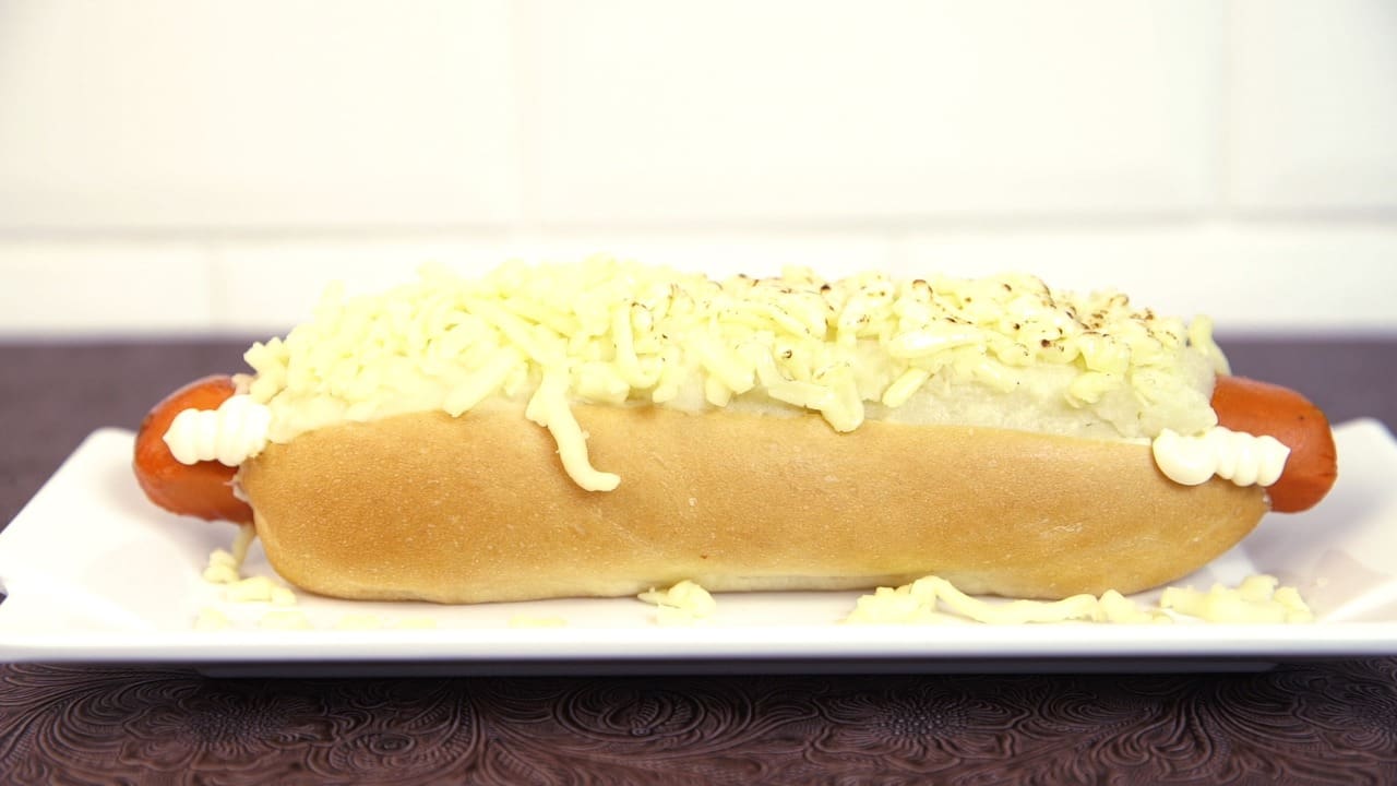 2 salsichas, maionese, purê de batata, cheddar cremoso e bacon.