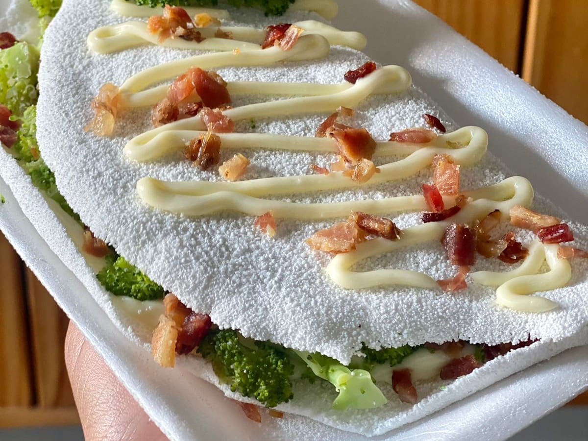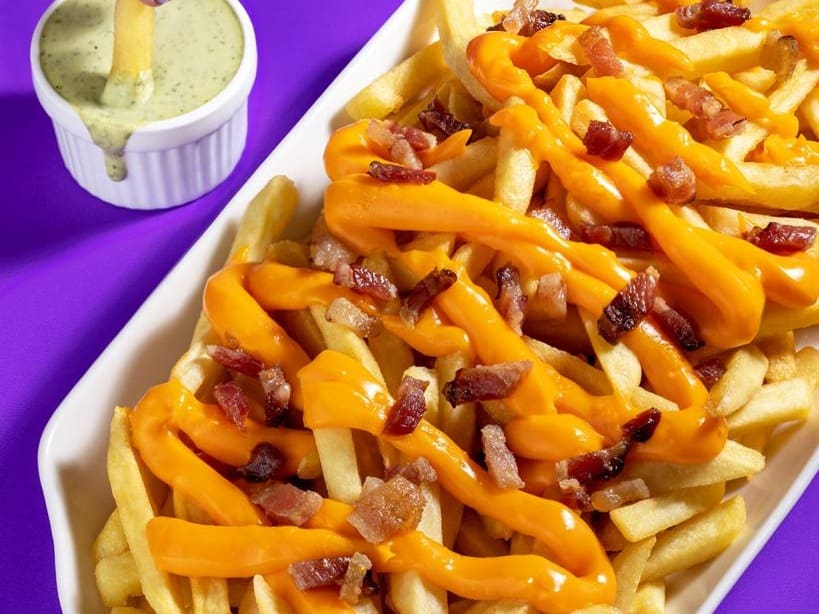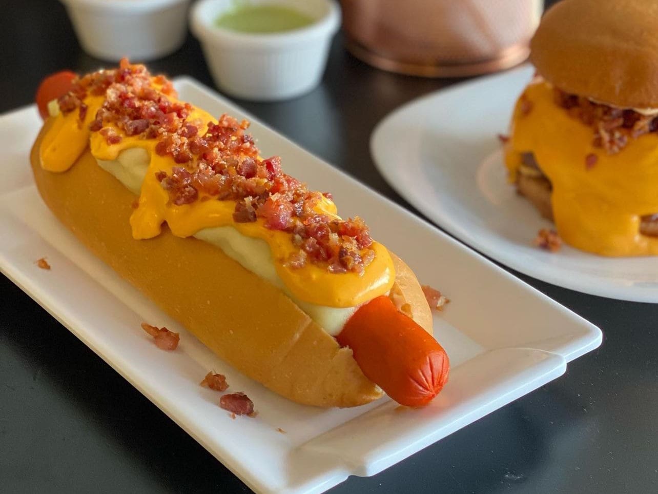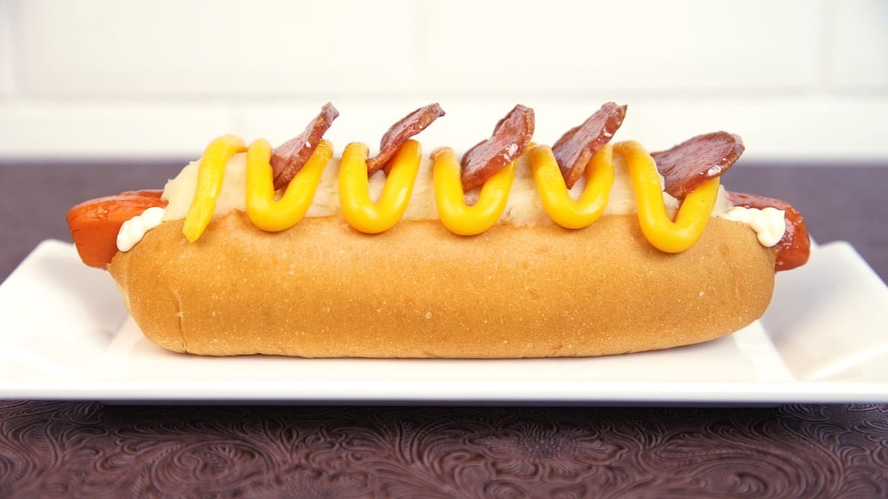 2 salsichas, maionese, purê de batata, cheddar cremoso e bacon.