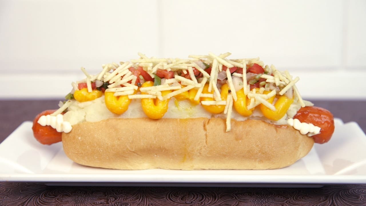 2 salsichas, maionese, purê, Catupiry e bacon.