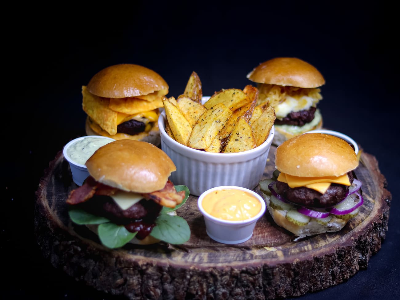 4 mini hambúrgueres com 100g cada. batata rustica. 3 molhos diferentes.