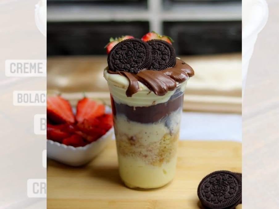 Bolo, creme de Ninho, Nutella, bolacha Oreo, creme de Oreo e morango.