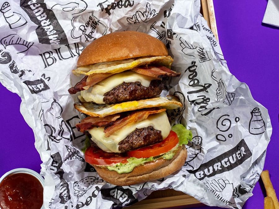 2 hambúrgueres, 2x queijos, 2x ovos, 2x bacon, tomate, alface e molho da casa.