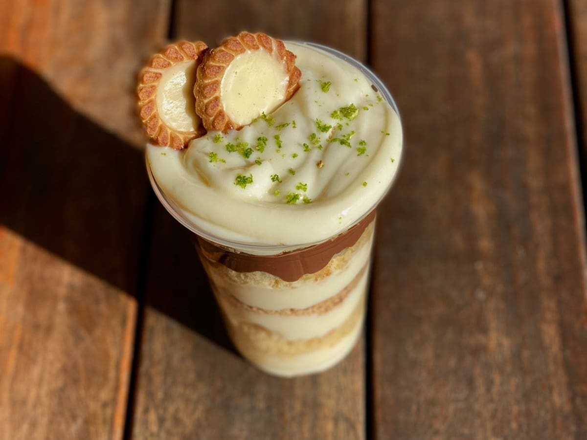 Bolo, mousse de limão, farofinha de bolacha, Nutella e tortinha de limão.