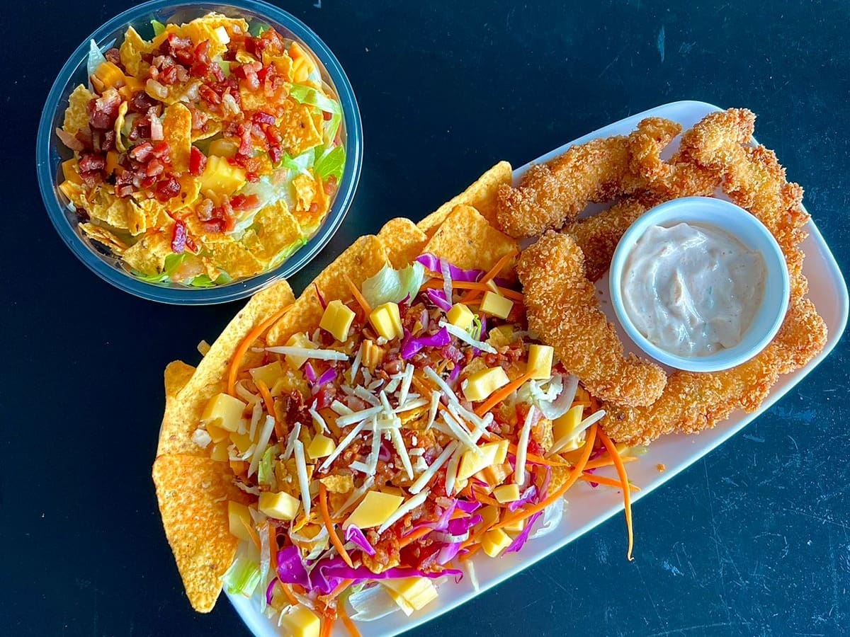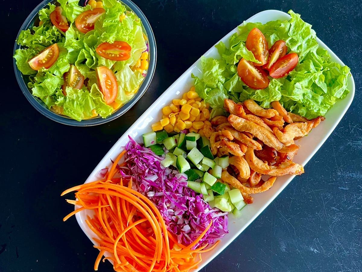 Alface crespa, milho, repolho roxo, cenoura, pepino, cebola roxa, tomate cereja e molho especial.