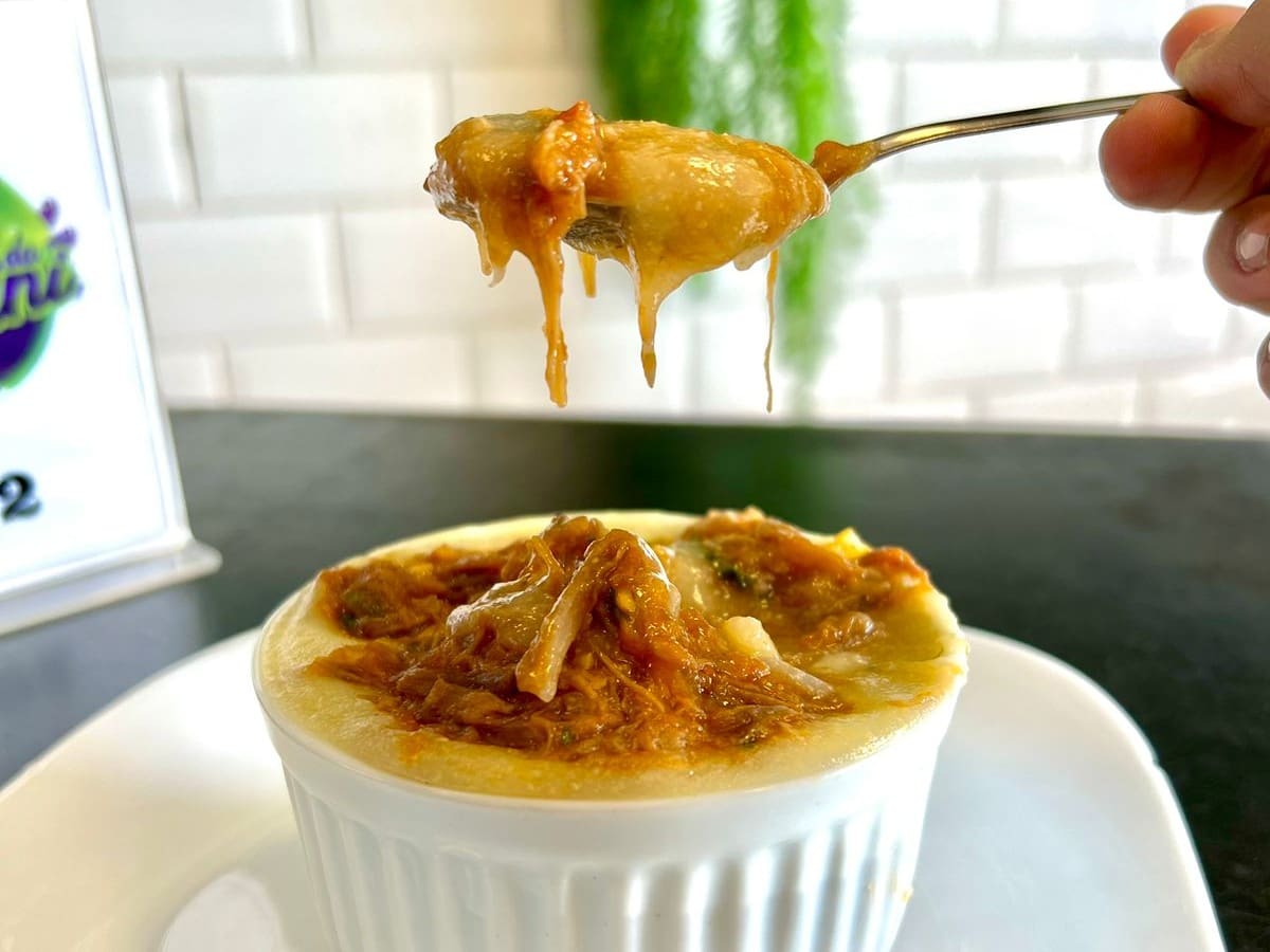 Polenta cremosa acompanha carne maluca e queijo muçarela.