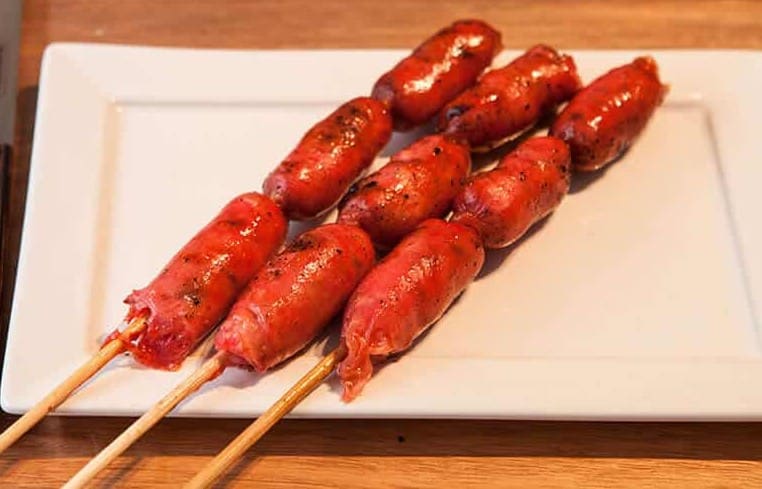 Linguiça e queijo no pão francês. Acompanha fritas e vinagrete.