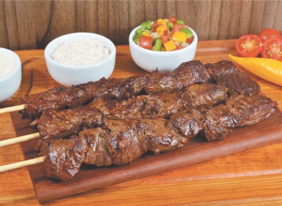 Grelhado na brasa, acompanha vinagrete, farofa da casa e pão de alho. Imagem ilustrativa. 600 g in natura. Serve até 3 pessoas.