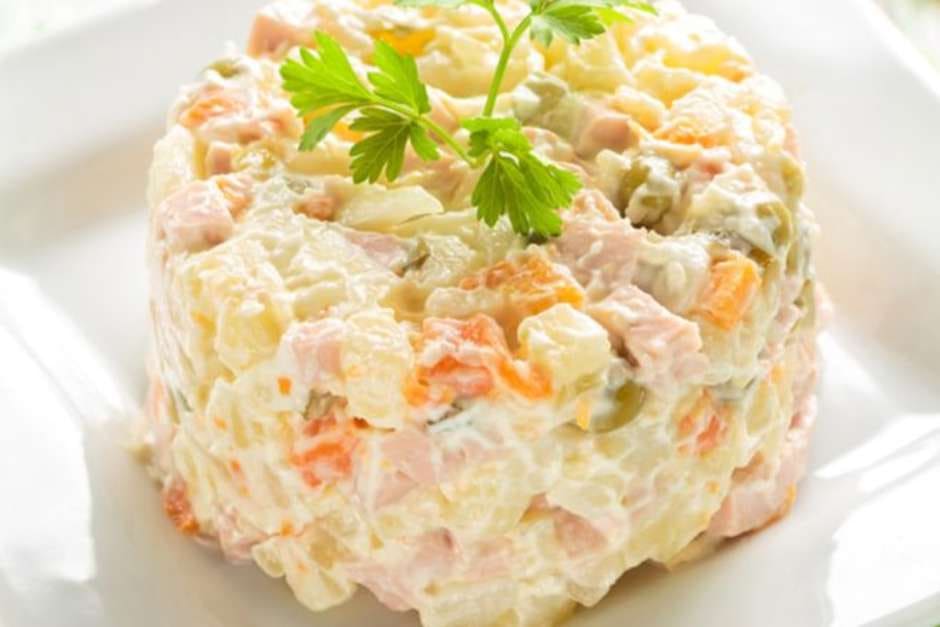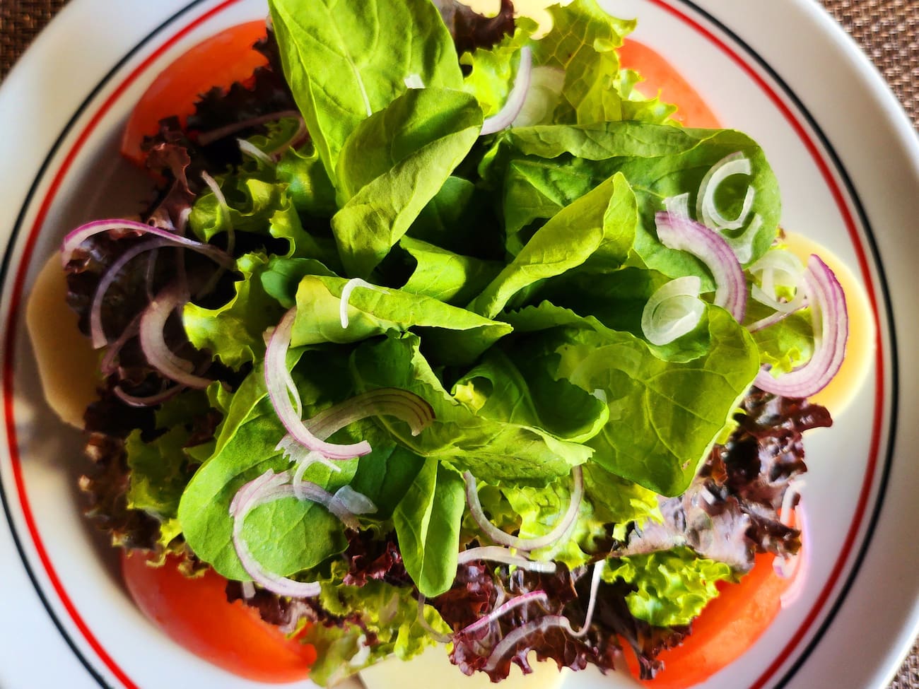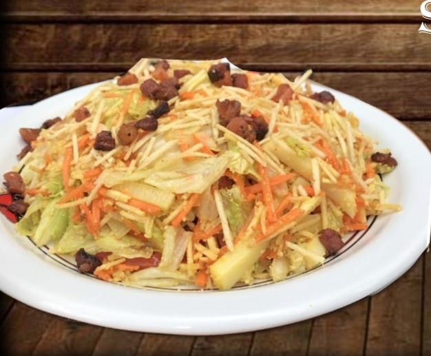 Feita com alface americana, tomate, palmito, cenoura,batata palha, parmesão, bacon, molho de mostarda e mel.