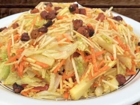Alface americana, tomate, palmito, cenoura, batata palha, bacon, parmesão. Acompanha molho mostarda e mel.