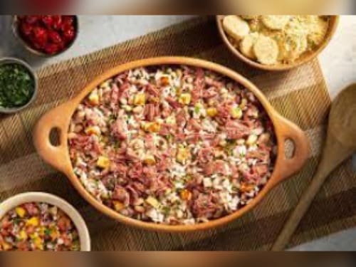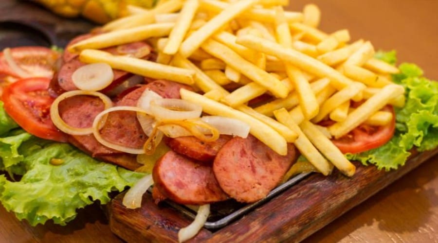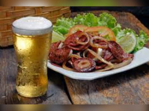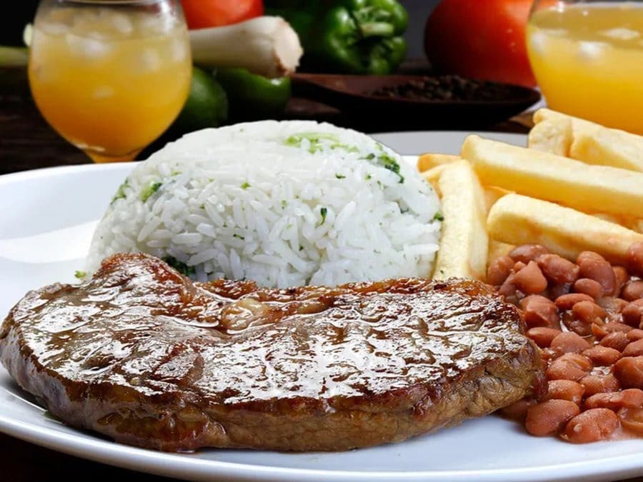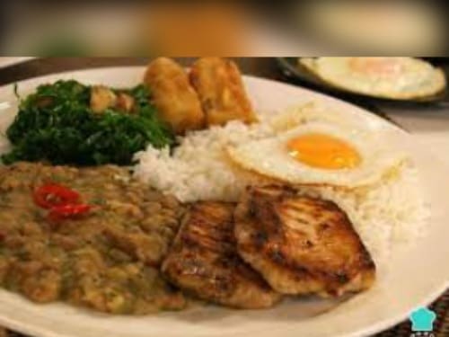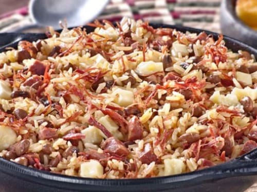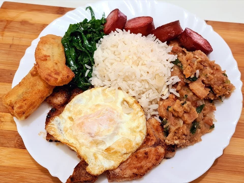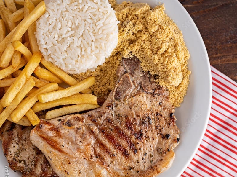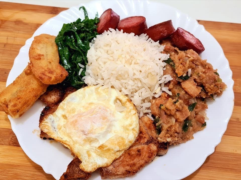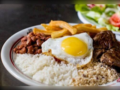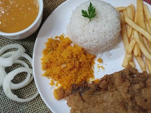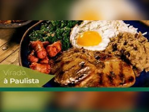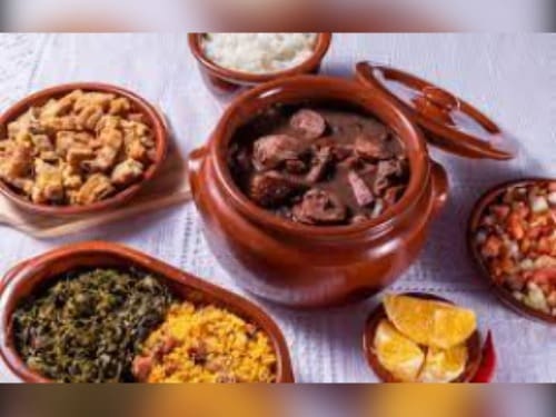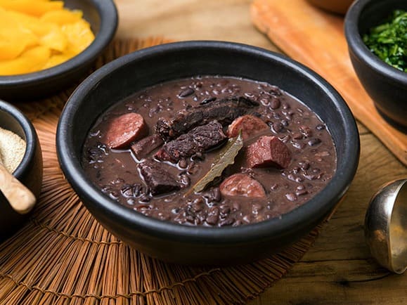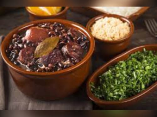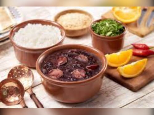 Acompanha feijão preto, couve, arroz, bisteca, carne seca, paio, torresmo, farofa, laranja, pimenta, linguiça, costela, pé, rabo e orelha