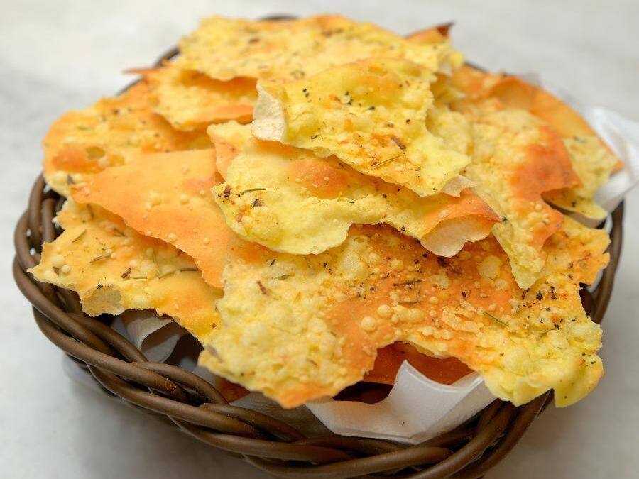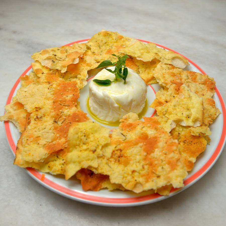 Burrata acompanhada por porção de crostine.