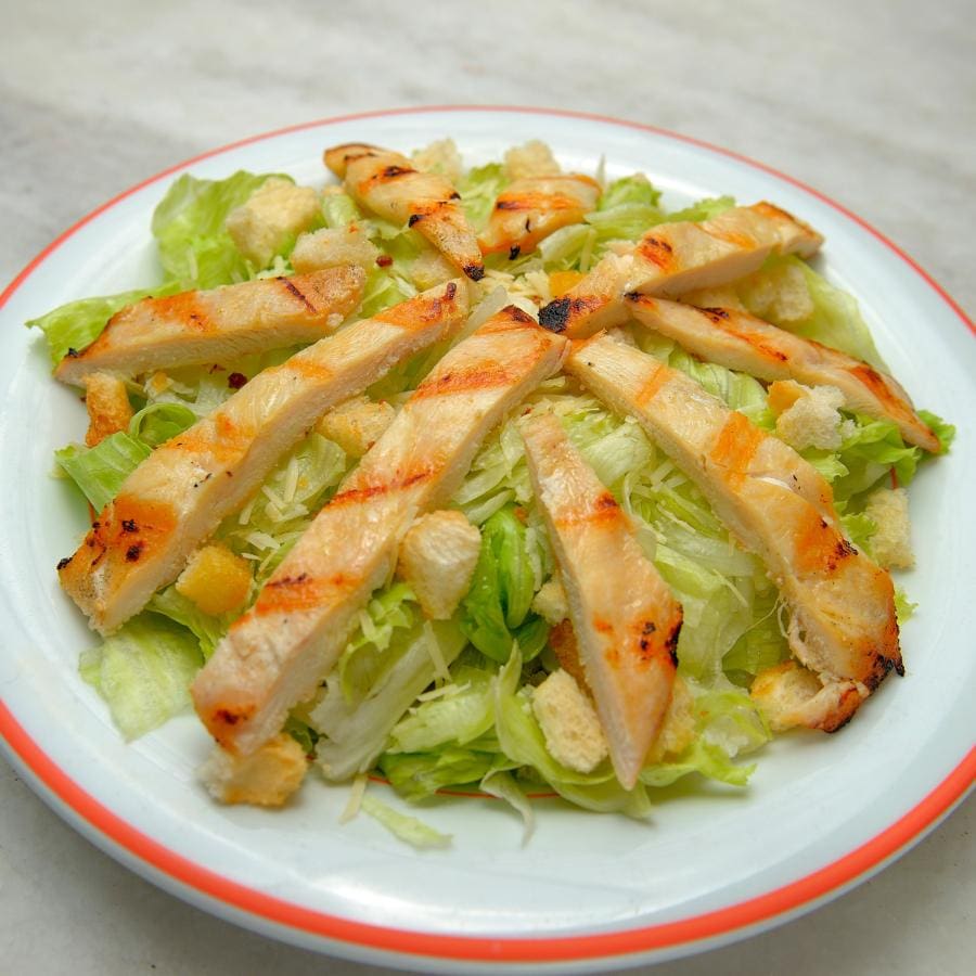 Alface americana, lascas de parmesão, croutons, tiras de filé de frango grelhado e molho caesar..