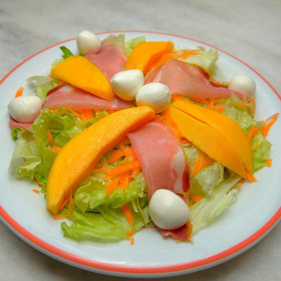 Alface americana, manga, presunto cru, mozarela de búfala, cenoura ralada, molho a base de mel, vinagre balsâmico, suco de limão e azeite.