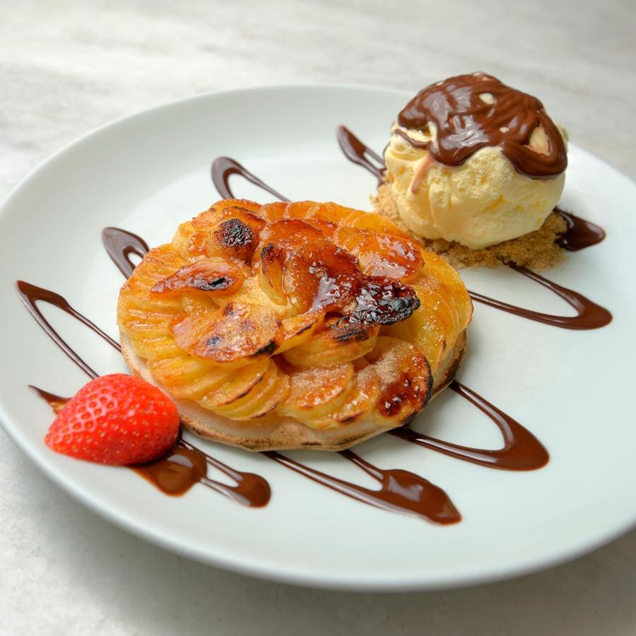 Pizza pequena de banana com açúcar, canela, rum e sorvete de creme.