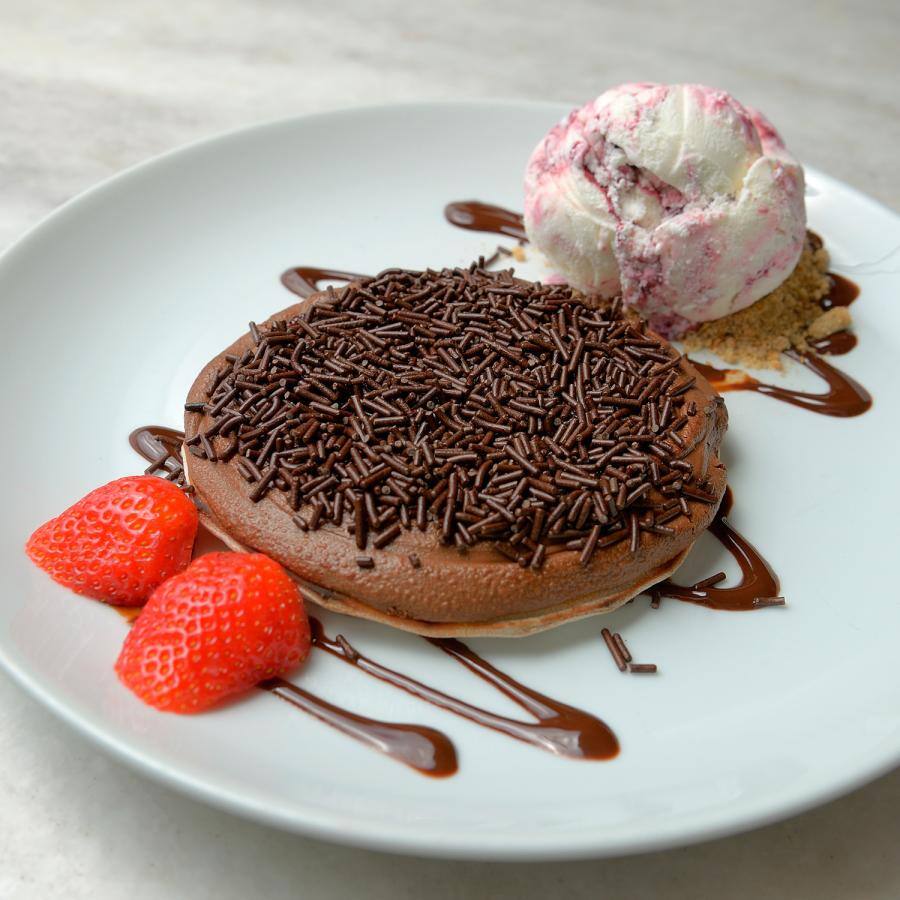Pizza pequena de chocolate com granulado acompanhada de sorvete sabor creme.