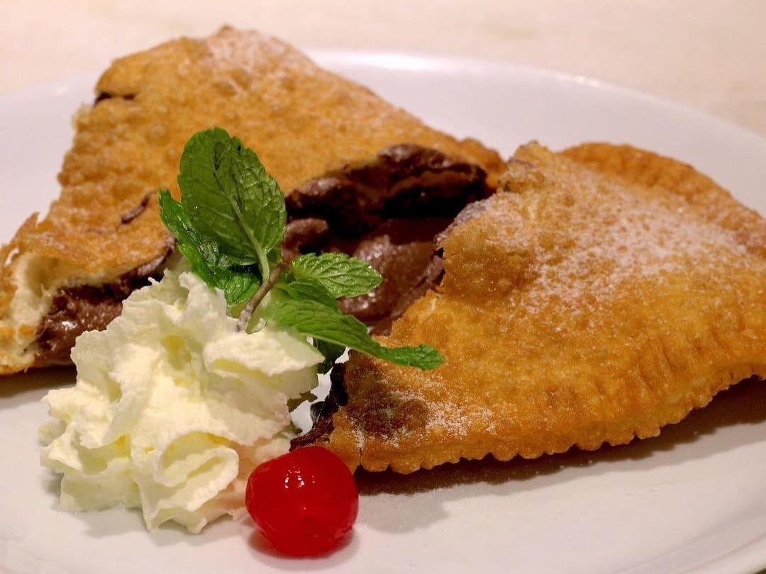Pizza frita recheada de Nutella salpicada com açúcar e canela.